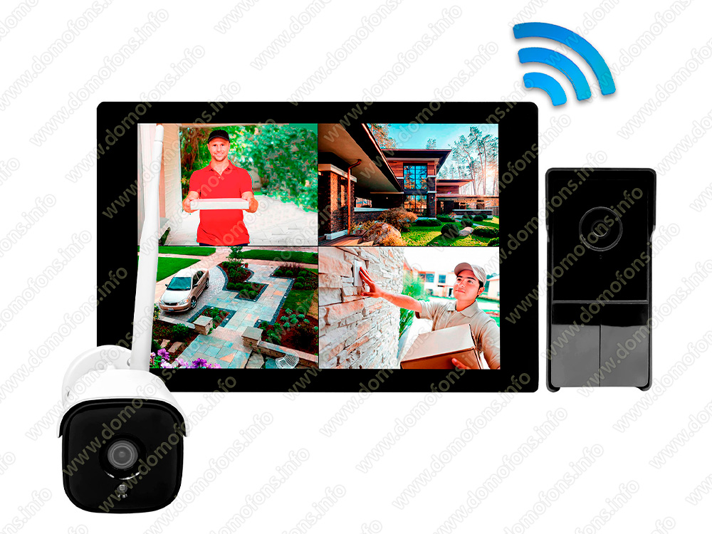 Комплект радиоканальный Wi-Fi TUYA видеодомофон с уличной камерой наблюдения "SkyNet 1000 (1+1)" Wi-Fi HD экран на 10 дюймов, 3MP вызывная видеопанель с ИК подсветкой и уличная беспроводная видеокамера 3MP